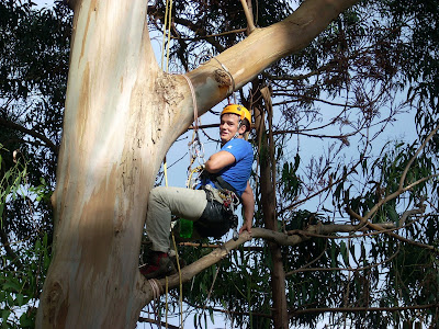 This is Marco, a neighbor in Fazenda, using his rock climbing gear to scale our massive Eucalyptis tree in the back yard.